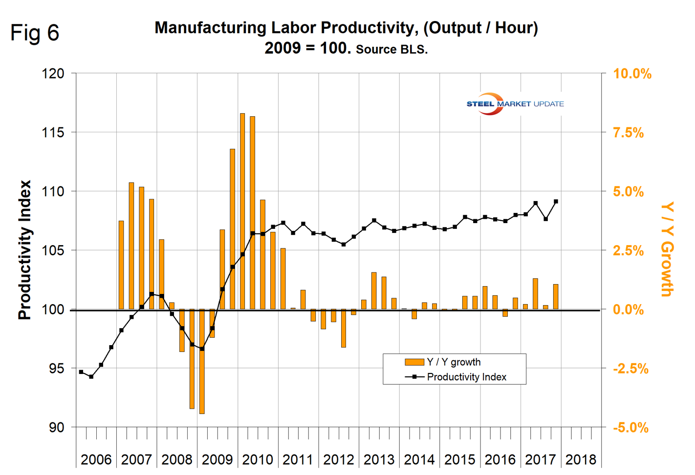 Manufacturing Productivity: The Bureau of Labor Statistics reported that in Q4 2017 manufacturing productivity improved by 1.1 percent year over year (Figure 6). Productivity growth was erratic in 2017, but there has been a gradual improvement for three years.