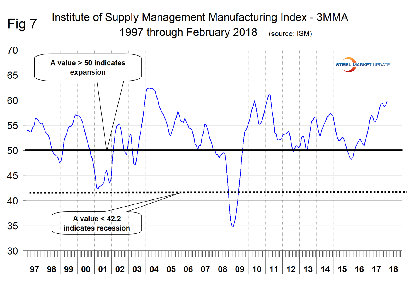 The ISM Manufacturing Index: The Institute for Supply Management’s Manufacturing Index is a diffusion index. ISM states: “Diffusion indexes have the properties of leading indicators and are convenient summary measures showing the prevailing direction of change and the scope of change. An index value above 50 percent indicates that the manufacturing economy is generally expanding; below 50 percent indicates the opposite.” Figure 7 shows the 3MMA of the ISM index from January 1997 through February 2018 with an improving trend since January 2016. In February, the 3MMA of the index at 59.73 was the highest since April 2011.