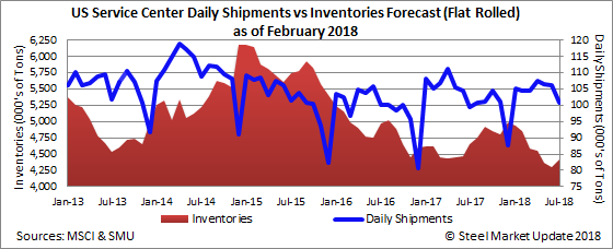 Receipts coming into the service centers has been harder to predict. SMU forecast daily receipts to rise from 96,895 in December to 121,849 tons in January. They rose at a much lesser rate to 102,650 tons. Total receipts were forecast to rise from 1,938,000 tons in December to 2,681,000 tons in January, and MSCI reported them to be 2,258,000 tons.