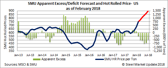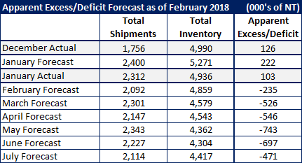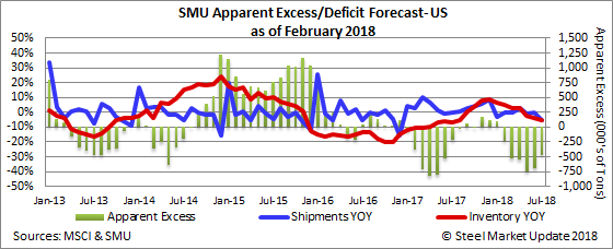 With the change in the model, our new forecast is for U.S. service centers to be holding a deficit of -235,000 tons through the end of February and for that deficit to grow throughout the summer months.