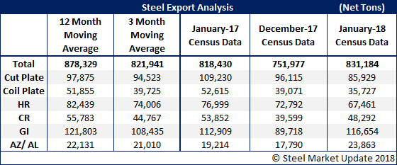 U.S. steel exports in January totaled 831,184 net tons (754,038 metric tons), up 10.5 percent from the month before, and up 1.6 percent from January 2017. Total exports have averaged around 850,000 tons over the last few months after reaching a 2.5-year high in May 2017 (1,006,087 tons). The total January export figure is above the three-month moving average (average of November 2017, December 2017 and January 2018), but below the 12-month moving average (average of February 2017 through January 2018). Here is a breakdown of flat rolled and plate steel exports: