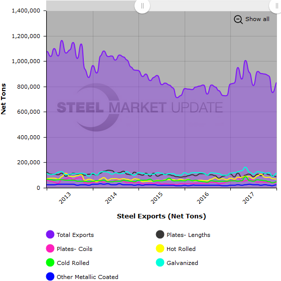 To see an interactive graphic of our Steel Exports history (example below), visit our website here. If you need any assistance logging in or navigating the site, contact us at info@SteelMarketUpdate.com or 800-432-3475.