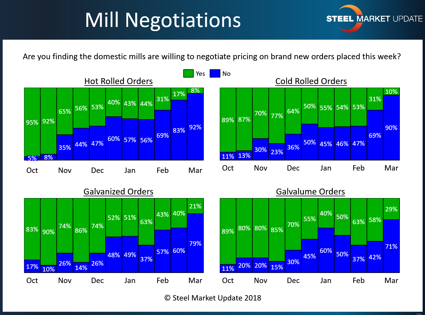 With foreign steel offers largely on hold as the market awaits President Trump’s final decision on steel tariffs, domestic steel mills are in a strong bargaining position and are taking full advantage of it. Nine out of 10 steel buyers responding to Steel Market Update’s market trends questionnaire this week say the mills are unwilling to negotiate on hot rolled and cold rolled orders, and nearly as many are holding the line on galvanized and Galvalume.