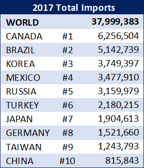 The table below shows the top 10 importers of steel to the U.S. in 2017, in net tons. Note that Canada was No. 1 and Mexico No. 4, accounting for about 25 percent of all U.S. imports last year.