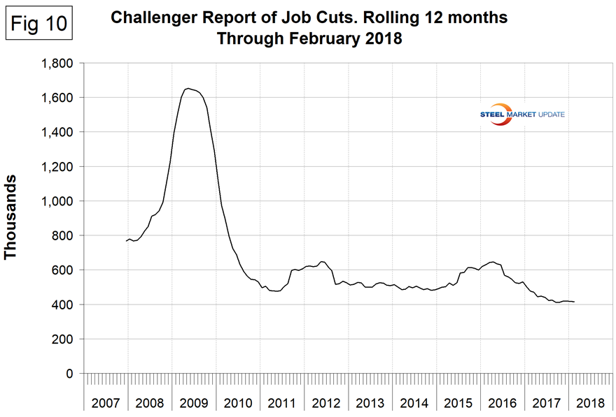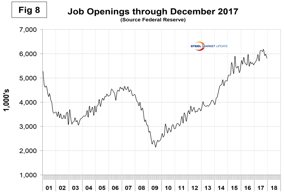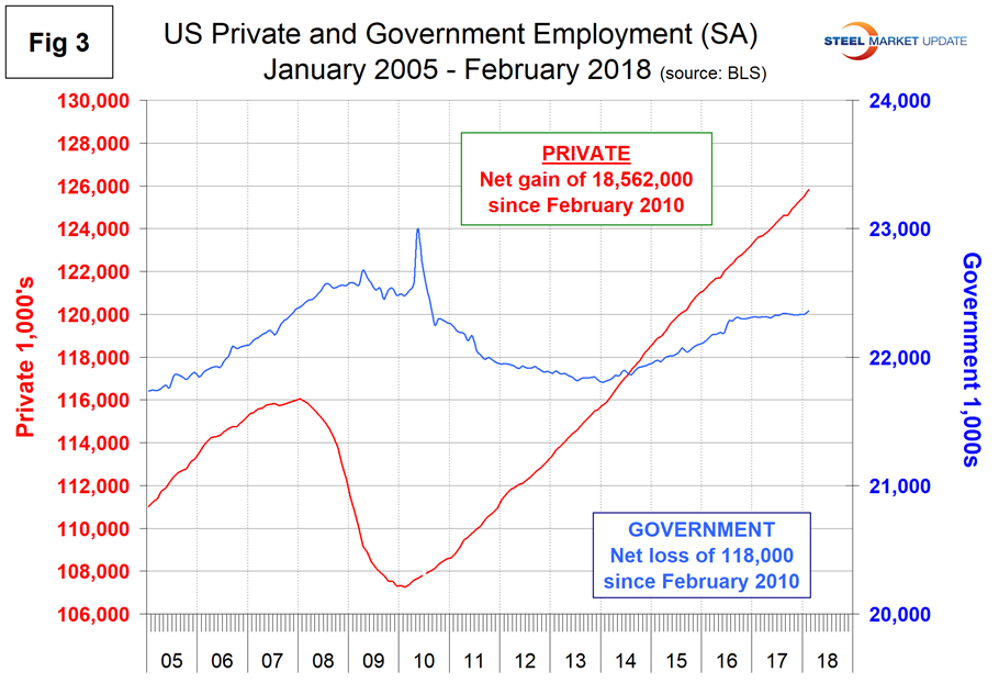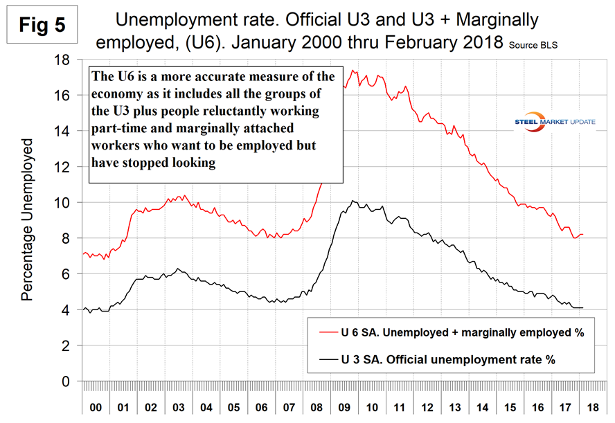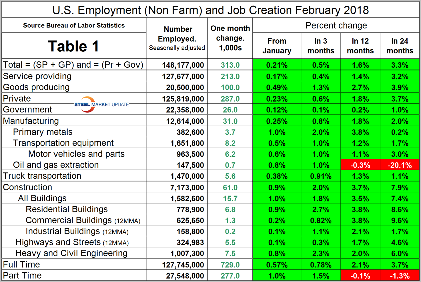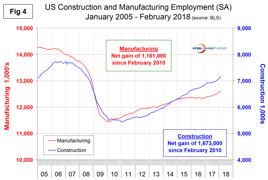 SMU Comment: Rising employment and wages are the basis of GDP growth because personal consumption accounts for almost 70 percent of GDP. Steel consumption is related to GDP; therefore, we need to be aware of changes to the employment picture. As we enter 2018, the employment situation is very good, job openings are close to an all-time high and new claims for unemployment are at a 44-year low. Manufacturing employment is 1.8 percent higher than this time last year and construction is up 3.7 percent. The employment situation has been described as “full” by some analysts. February was the 87th consecutive month of job growth. If as reported there is a shortage of qualified employees, we can expect an increase in wage-driven inflation soon. Employment growth in manufacturing and construction are signposts for steel sales activity. 2018 is starting at a very strong pace.