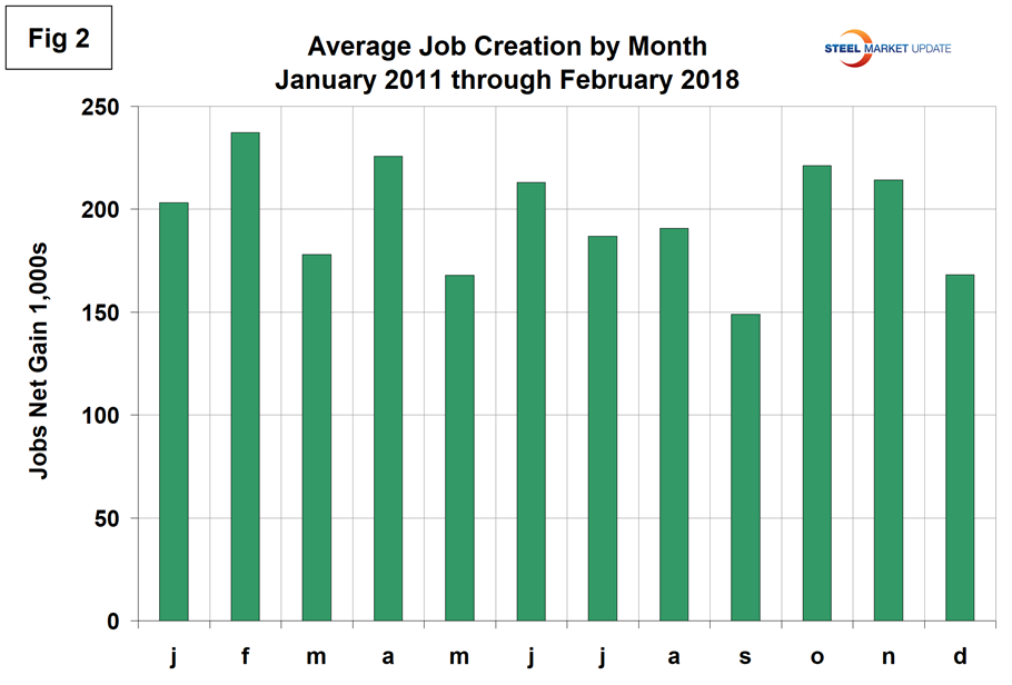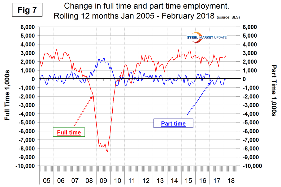 In February, service industries expanded by 213,000 as goods-producing industries, driven mainly by construction and manufacturing, expanded by 100,000. This continues to be good news for steel demand as both steel consuming sectors have done well in the last seven months, during which time construction has added 239,000 and manufacturing 190,000 jobs. Since February 2010, service industries have added 15,571,000 and goods-producing 2,873,000 positions. This is part of the reason why wage growth has been slow since the recession as service industries on average pay less than goods-producing industries such as manufacturing.