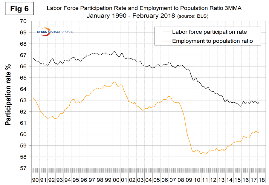 The employment participation rate is calculated by dividing the number of people actively participating in the labor force by the total number of people eligible to participate. This measure was 63.0 percent in February, which was up from 62.7 percent in each month October through January. Another gauge is the number employed as a percentage of the population, which we think is more definitive. In February, the employment-to-population ratio was 60.4 percent, up from 59.7 percent in January 2017 and from 59.5 percent in January 2015. The employment-to-population ratio has made progress for the last four years, but the labor force participation rate has been stalled for two years. Figure 6 shows both measures on one graph.