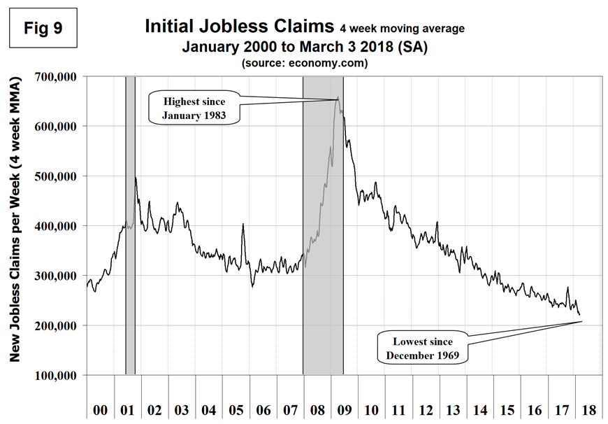 Initial claims for unemployment insurance, reported weekly by the Department of Labor, flattened in 2017 except for the hurricane-driven spike. New claims are at the lowest level since 1969. In the week ending March 3, initial claims were 231,000 with a four-week moving average of 222,500 claims. This marks the longest streak since 1973 of initial claims below 300,000 (Figure 9).