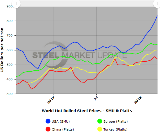 Platts published Turkish export prices at $601 per net ton FOB Turkish port, up $2 from two weeks ago. Adding $90 in import costs, the Turkish HRC “to the U.S. ports” price is $691 per ton. This moves the spread between the Turkish and U.S. HR price from +$101 per ton two weeks ago to +$149 per ton today, meaning HR from the U.S. is theoretically $149 per ton more expensive than steel imported from Turkey. The Turkey/U.S. price spread has increased week by week since September/October 2017 when it dropped down to -$36 per ton (meaning domestic HR was $36 per ton cheaper than importing Turkish HR).