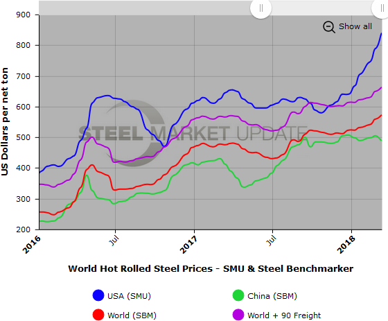 The SteelBenchmarker world export price for hot rolled bands is $572 per net ton FOB the port of export, according to data released by SteelBenchmarker on Monday, March 12. This is up $12 per ton from two weeks ago. Adding in $90 in estimated import costs, that puts prices around $662 per ton delivered to the U.S. As previously mentioned, the Steel Market Update hot rolled price average this week is $840 per ton.