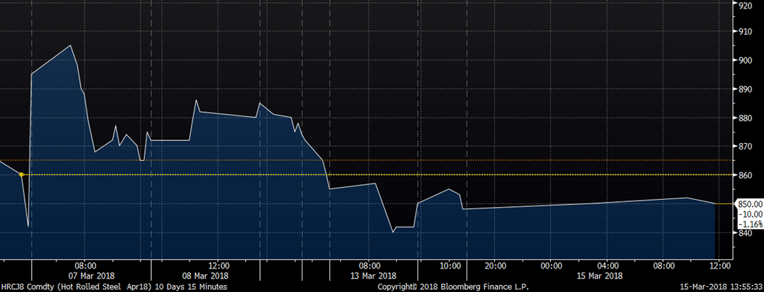 Gary Cohn’s resignation after the close of business Tuesday March 6 signaled President Trump’s threat to implement tariffs on steel and aluminum imports was going to become reality. Early last Wednesday morning, Midwest HRC futures traded up $40-$50 in response, with the April future trading above $900/st. Later that morning, U.S. Steel announced plans to reopen Granite City Works, and futures traded right back down to as low as $865. This type of “tape” can be indicative of a “blow-off top.” If you are a bull, you’d like to see the April future trade back above $900. Word on the street is there are late May spot tons being offered at $900/st, so it is entirely possible the rally resumes. Fading this rally has been treacherous thus far! The one solid bet on the board is that futures will remain super volatile!