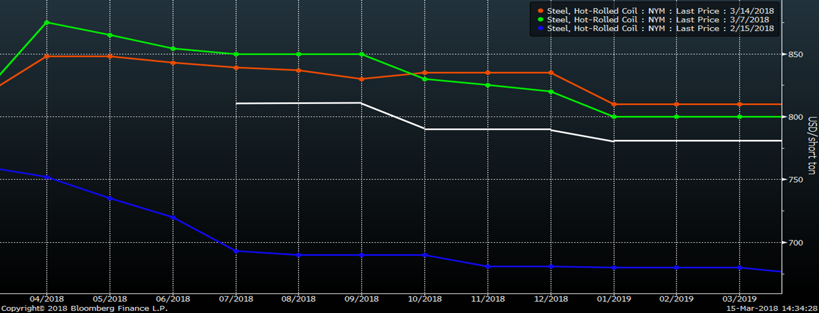 Despite this week’s sharp move higher in the CRU Index, HRC futures have remained under pressure. This chart shows the CME Midwest HRC futures curve on Feb. 15 (blue), the day before the 232 announcement, March 8 (green) and March 14 (orange). Futures moved $100 – $150 higher in response to the 232, but the back half of 2018 has been under pressure this week as buyers have been difficult to locate. Today, the second half of 2018 was offered as low as $810/st with no buy side interest. The white line is a best guess at where the curve settles tonight showing the abrupt move lower in second half futures.