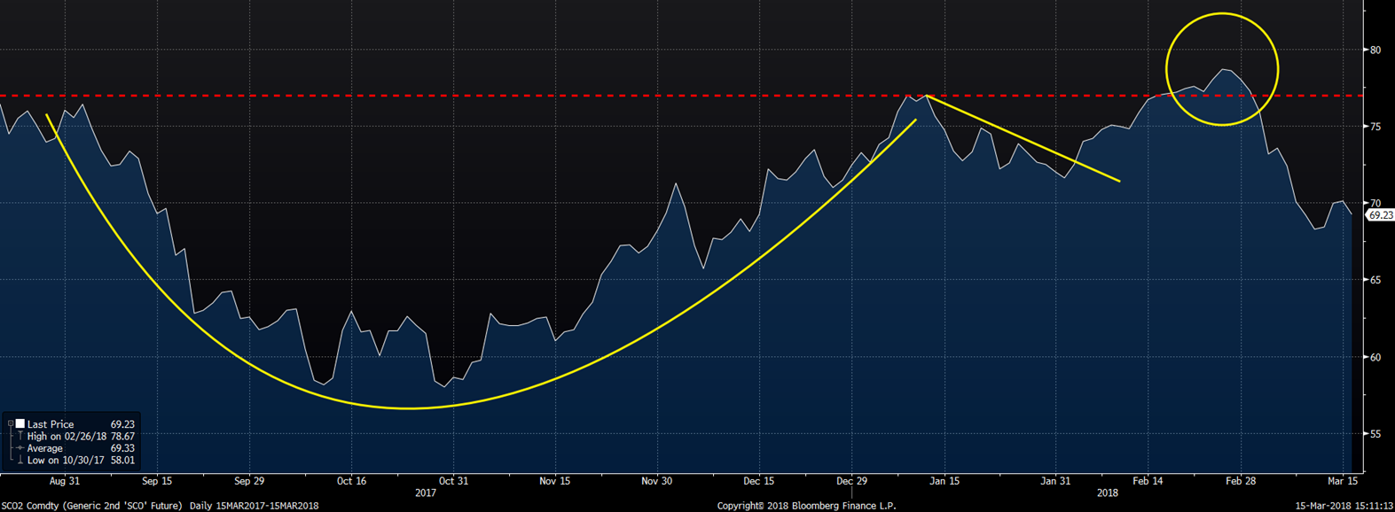 We had been getting technical with a “cup and handle” pattern in iron ore. Ore prices peeked above the top level and then failed miserably. Not a good sign for iron ore prices.