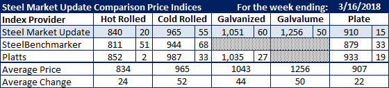 Cold rolled prices were up double digits on all three indexes with Platts at $987 per ton, SMU at $965 per ton and SteelBenchmarker at $944 per ton.