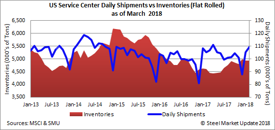 U.S. service centers shipped 3.289 million tons of steel products in February, an increase of 4.7 percent over February 2017, but a decrease of 5.6 percent from January. U.S. service center inventories at the end of February totaled 7.740 million tons or 2.4 months on hand. That’s a 5.4 percent increase from the 7.342 million tons in inventory, and up slightly from 2.3 months on hand, in February last year. Tons shipped per day in February totaled 164,400, up from 158,400 in January and 156,300 in February 2017.