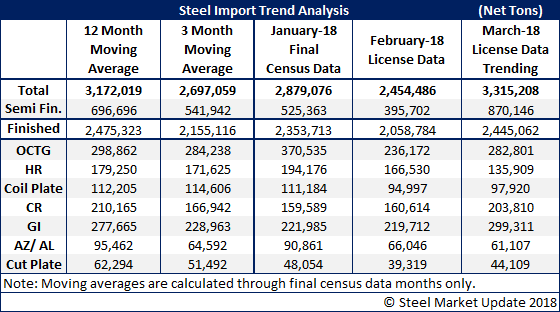 With the deadline for Section 232 quickly approaching, the 3.3 million tons of expected licenses may be a bit overstated as we believe there may be fewer vessels arriving after the 23rd than during a normal month. We do not, however, expect imports to drop significantly right away because of the run-up in domestic steel prices. This means that adding 25 percent duty to steel that was bought months ago still provides the ability to make a margin on the steel.