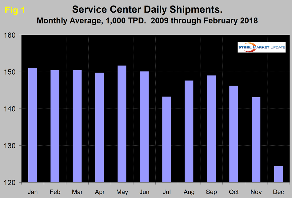 Service center shipments in February were stronger than the seasonal norm, according to Steel Market Update’s latest analysis of Metals Service Center Institute data.