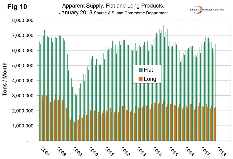 SMU Comment: In February, service center shipments improved for all products year over year, the extremes being plate up 12.5 percent and tubulars up 1.1 percent. There are differences between the MSCI data and some of our other information sources that we can’t reconcile. For example, based on AISI shipment data and USITC import data, tubular goods are doing much better than the MSCI data suggests. On the other hand, MSCI data for long products looks more believable than the AISI and import data. Figure 10 shows the total supply to the market of long and flat products based on AISI shipment and import data through January, which is the latest data available.