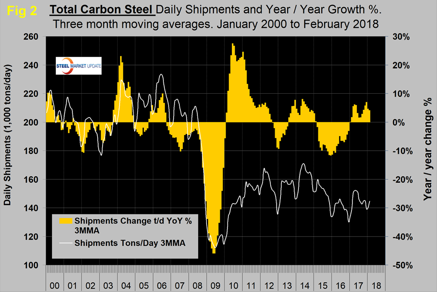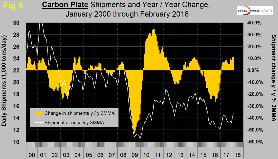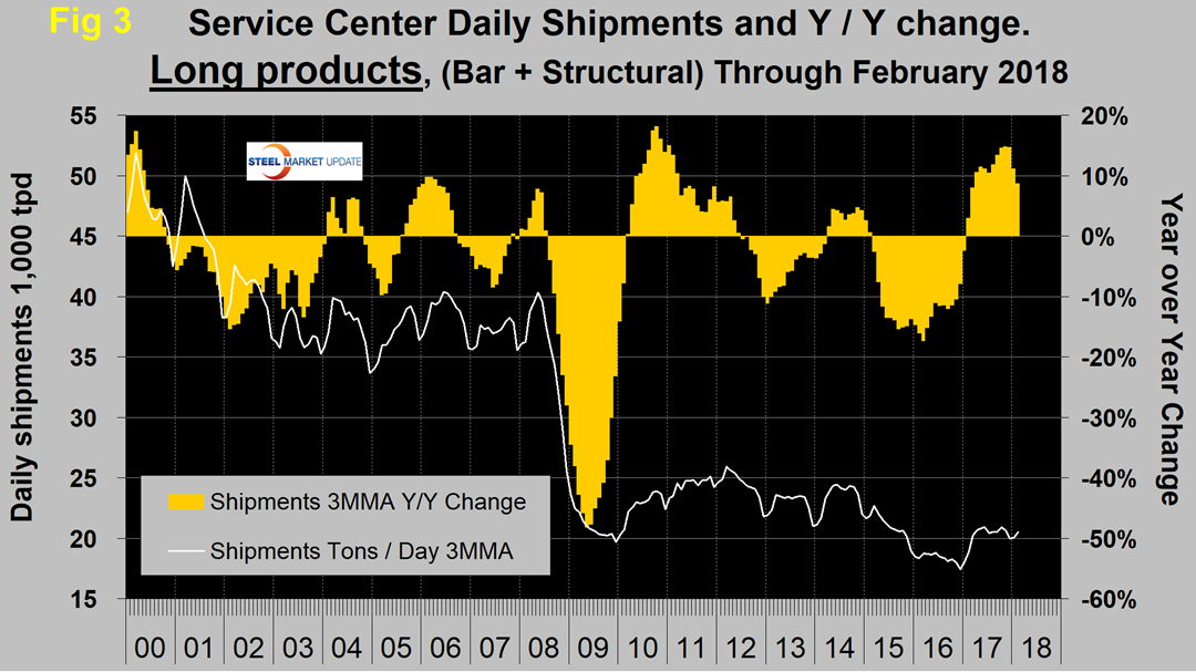 Shipments of all individual products were up from February last year. Figure 2 shows the long-term trend of daily carbon steel shipments since 2000 as three-month moving averages (3MMA). The quickest way to size up the market is the brown bars in Figures 2-6, which show the percentage year-over-year change in shipments by product.