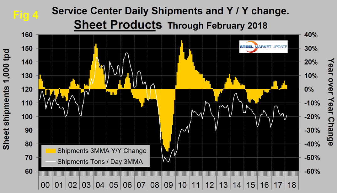 Figure 3 shows monthly long product shipments from service centers as a 3MMA with year-over-year change. Growth has been strong since March last year and in positive double digits every month from April last year through January this year. In February, growth was 8.7 percent.