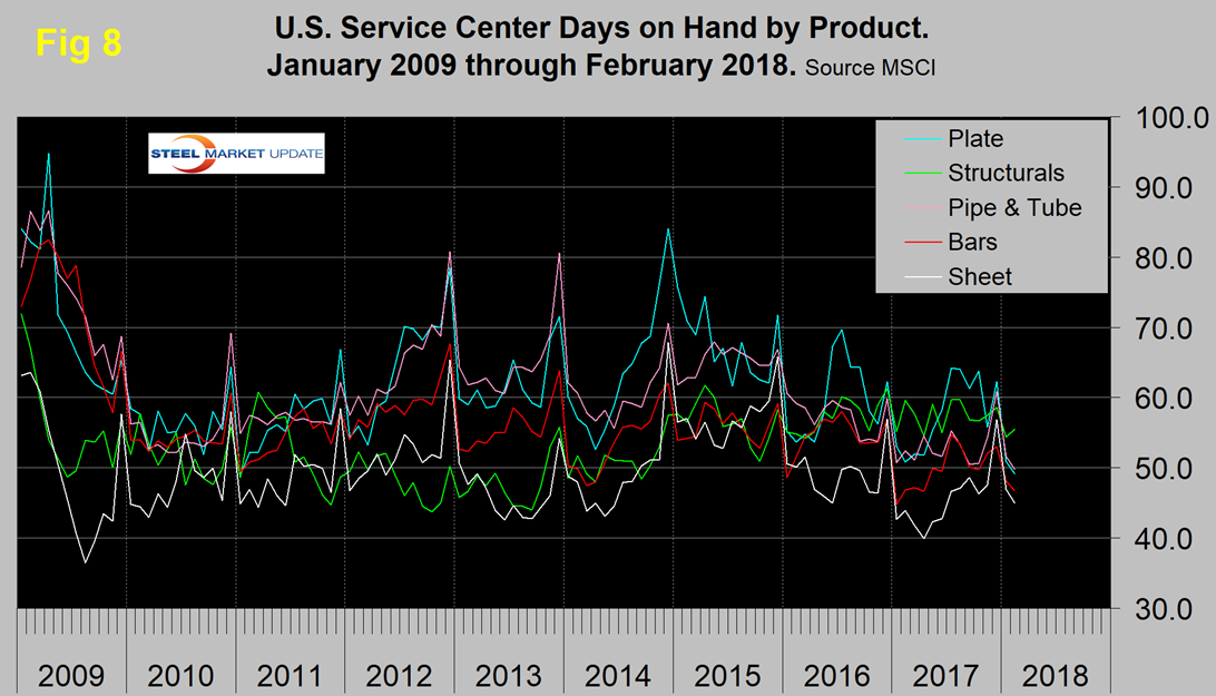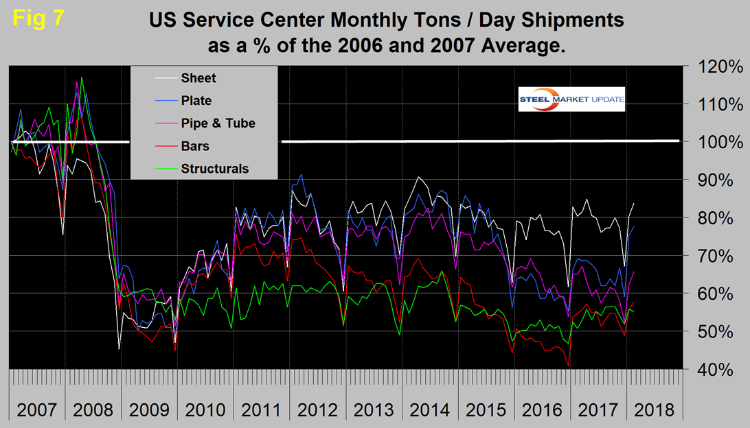 In 2006 and 2007, the mills and service centers were operating at maximum capacity. Figure 7 takes the monthly shipments by product and indexes them to the average for 2006 and 2007 to measure the extent to which shipments of each product have recovered. Each year, all products experience the December collapse and January pickup. In February, the total of carbon steel products was 73.8 percent of the average monthly shipping rate that occurred in 2006 and 2007. Structurals were 55.2 percent and bar was 57.7 percent. Sheet was at 83.7 percent, plate at 77.6 percent and tubulars at 65.7 percent.