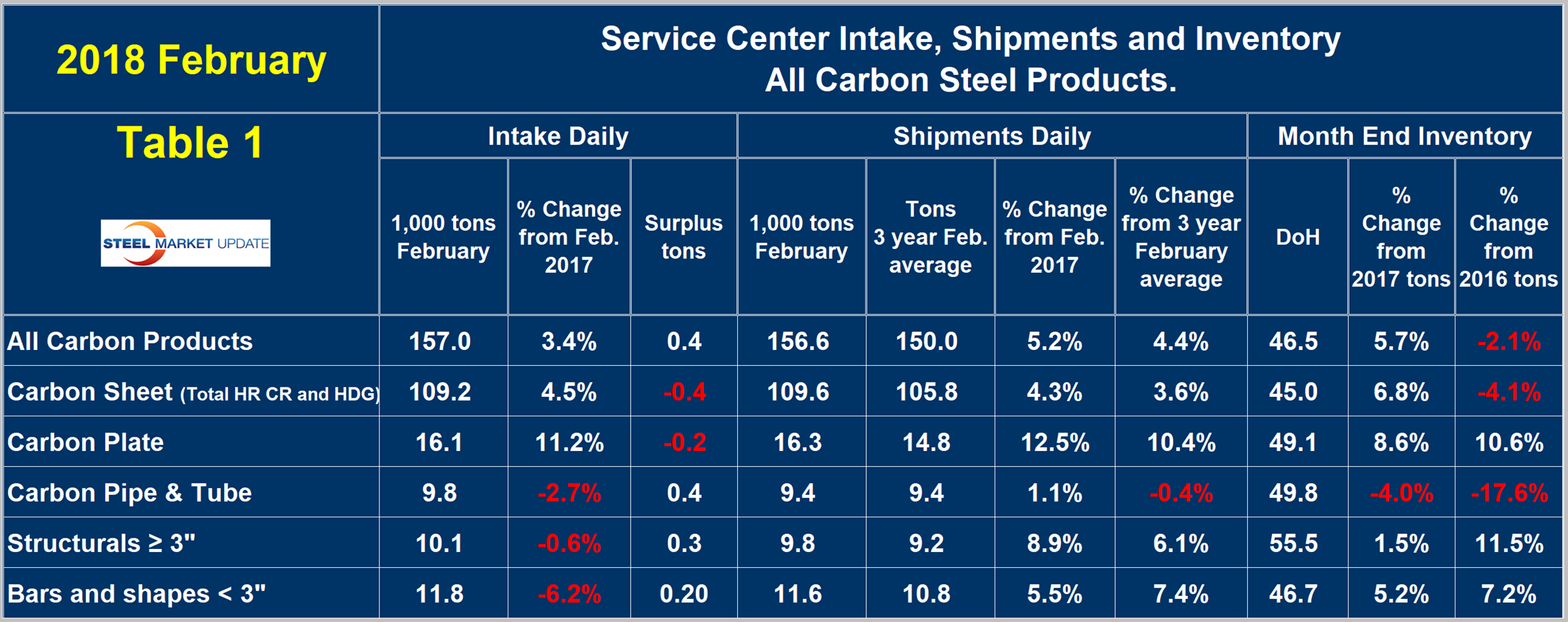 Daily shipments in February were 3.8 percent higher than in January. On average since 2009, February shipments have decreased by 0.4 percent; therefore, these latest numbers were seasonally better than the historical average for this time of year. Carbon steel shipments averaged 156,600 tons per day in February and days on hand as of the 28th totaled 46.5, which was down from 48.2 at the end of January.
