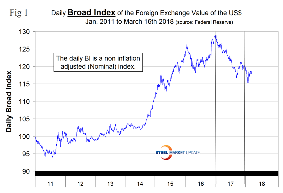 Explanation of Data Sources: The broad index is published by the Federal Reserve on both a daily and monthly basis. It is a weighted average of the foreign exchange values of the U.S. dollar against the currencies of a large group of major U.S. trading partners. The index weights, which change over time, are derived from U.S. export shares and from U.S. and foreign import shares. The data are noon buying rates in New York for cable transfers payable in the listed currencies. At SMU, we use the historical exchange rates published in the Oanda Forex trading platform to track the currency value of the U.S. dollar against that of 16 steel and iron ore trading nations. Oanda operates within the guidelines of six major regulatory authorities around the world and provides access to over 70 currency pairs. Approximately $4 trillion U.S. dollars are traded every day on foreign exchange markets.