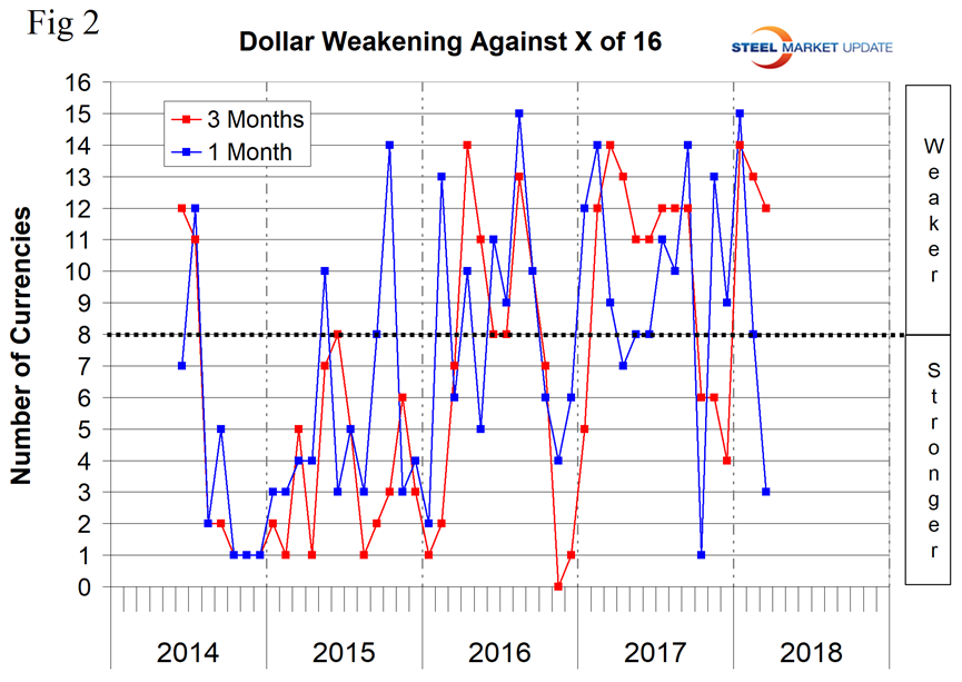 The euro has strengthened by 4.4 percent against the dollar in the last three months, but in the last month weakened by 0.9 percent. Since Jan. 1, 2017, the EU has shipped 5,312,000 tons of rolled steel products into the U.S., enough of a reason for their opposition to the Section 232 legislation.