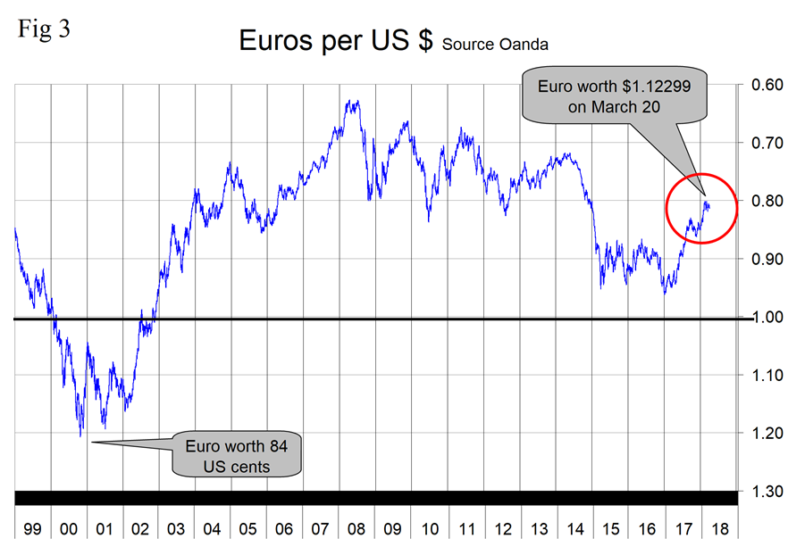 The Broad Index value of the U.S. dollar is reported several days in arrears by the Federal Reserve; the latest value published was for March 16. Figure 1 shows the index value since January 2011. The dollar had a recent peak of 128.96 on Jan. 3, 2017, which was the highest value in almost 15 years. The recent low point was Feb. 1, 2018, at 115.21. Since then, the dollar has recovered by 2.9 percent to 118.57 on March 16. The dollar has declined by 8.1 percent since Jan. 3, 2018.