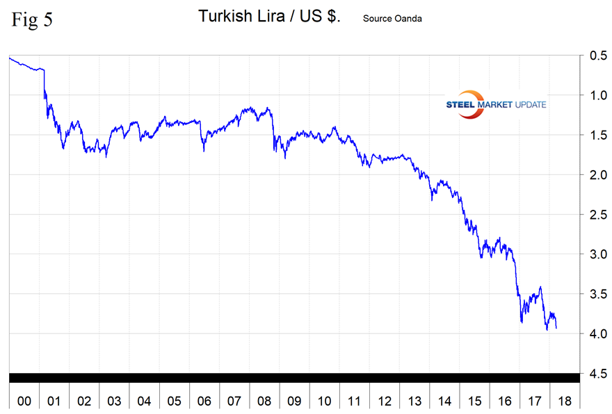 Turkey’s lira has declined by 9.3 percent in the last year and by 4.9 percent in the last month. Since Jan. 1, 2017, Turkey has shipped 2,293,000 tons into the U.S., putting them in sixth place. The highest volume items were rebar at 42 percent of the total, 17 percent cold rolled sheet and 14 percent HDG.