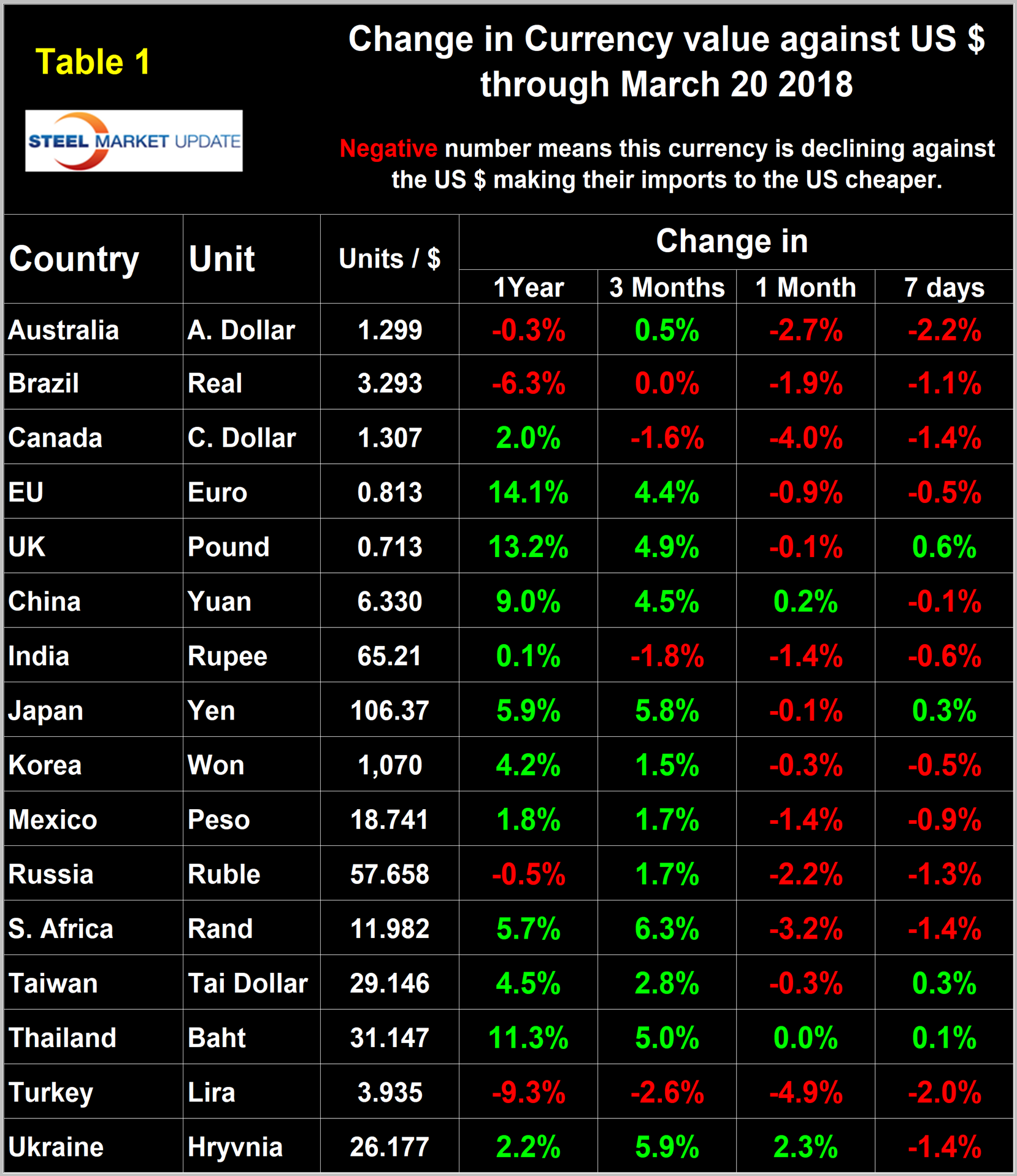 Each month, SMU publishes an update of Table 1, which shows the value of the U.S. dollar against the currencies of 16 major global steel and iron ore trading nations. The table shows the change in value in one year, three months, one month and seven days through March 20.