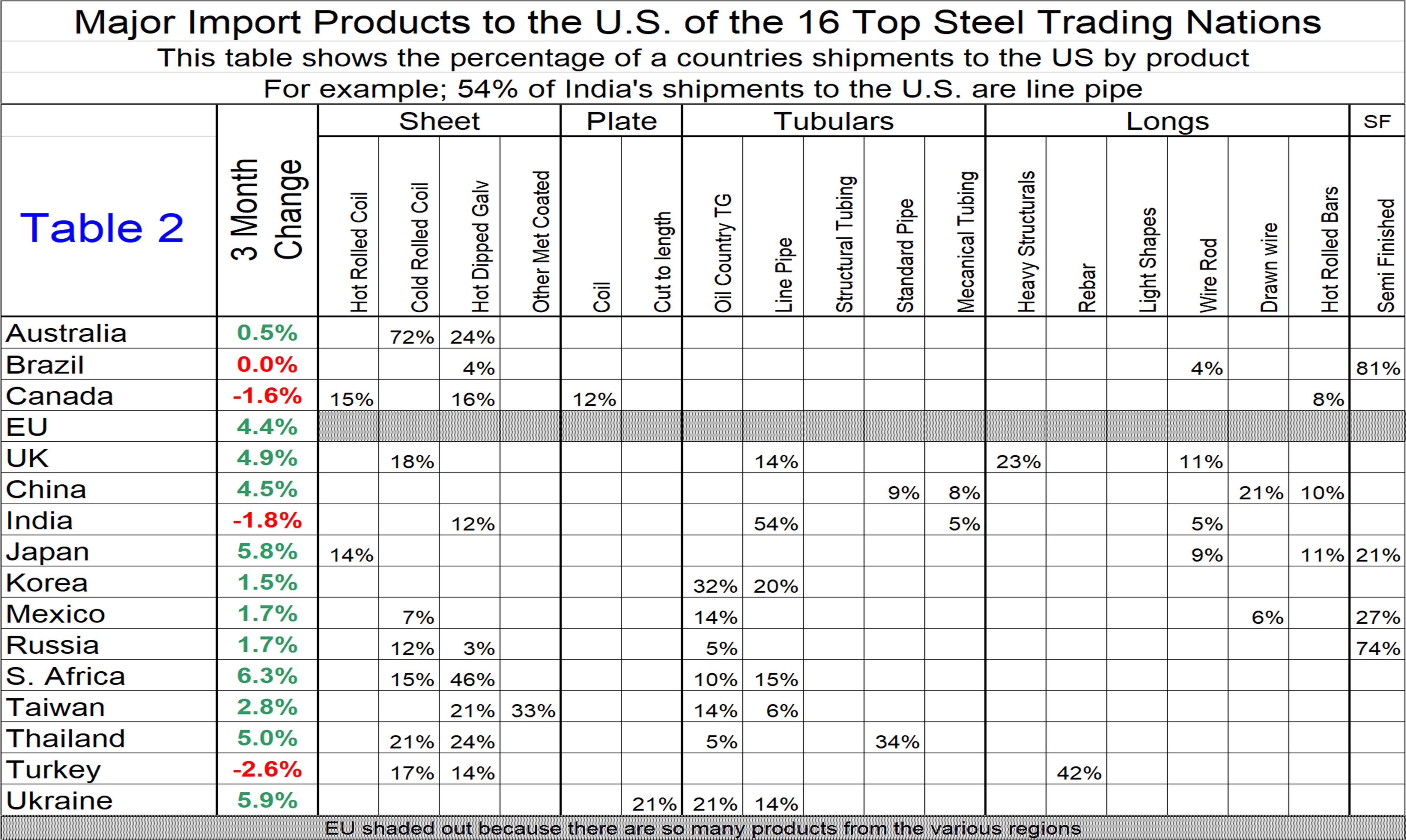 This month, for the first time, we have expanded our report to include Table 2. The intention is to show which products are in the portfolio of the 16 nations and to compare that with the three-month change in currency value. For example, if a subscriber is buying cold rolled coil from the UK, an alternative source would be Turkey with a currency price differential of 7.5 percent at the three-month level.