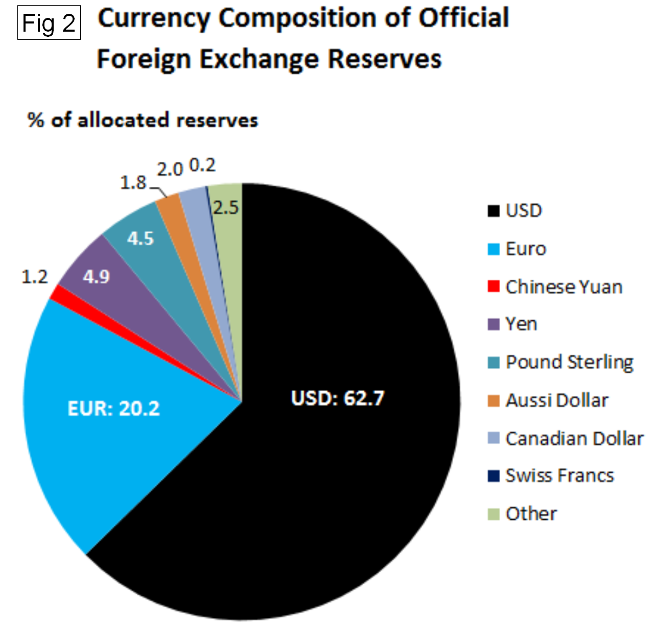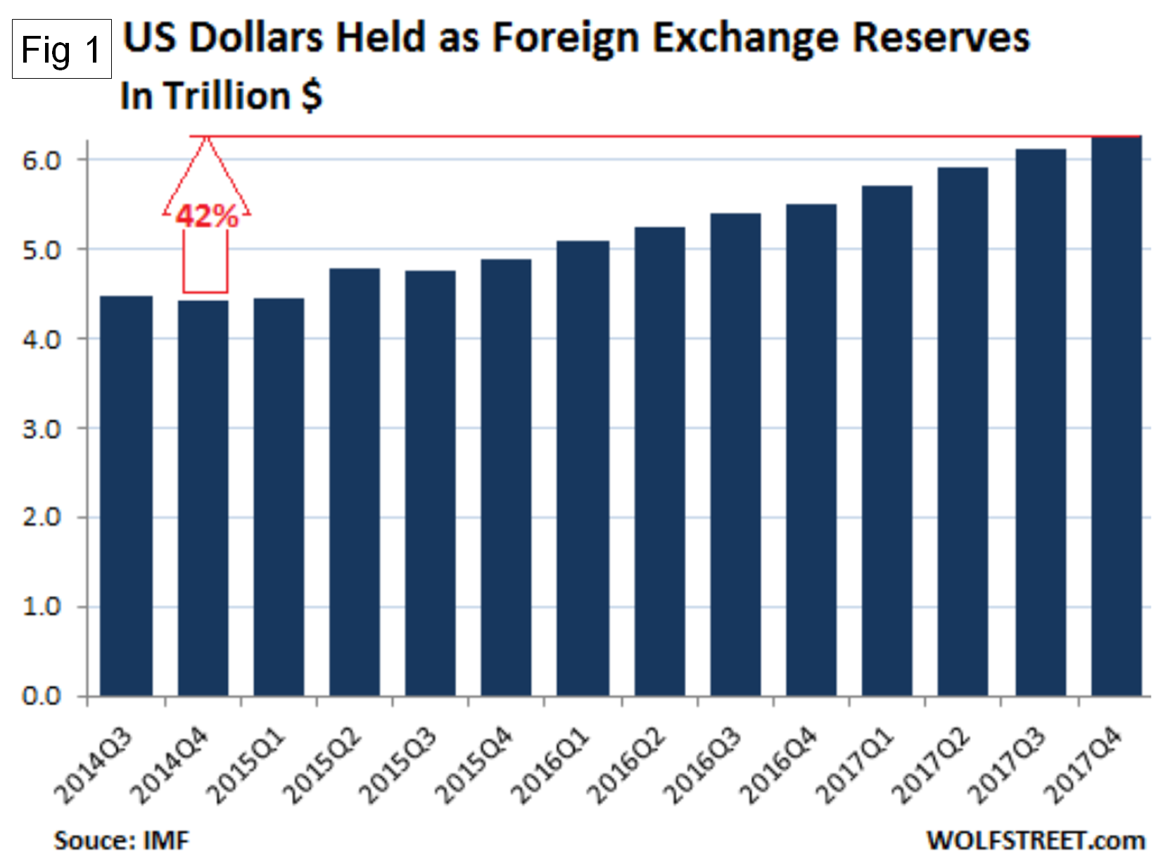 On March 31, currency analyst Wolf Richter examined the just-released IMF report on foreign exchange reserves in Q4 2017. He reported that dollar-denominated assets among foreign exchange reserves rose 14 percent year over year in Q4 to $6.28 trillion and are up 42 percent from Q4 2014 (Figure 1). There is no indication that global central banks have lost interest in the dollar. In Q4 2017, total global foreign exchange reserves, including all currencies, rose 6.6 percent year over year. For reporting purposes, the IMF converts all currency balances into dollars. Figure 2 shows the breakdown of the $11.42 trillion of foreign exchange reserves. Disappointingly for many folks, the Chinese yuan, the thin red sliver in the pie chart in Figure 2, didn’t exactly soar since its inclusion in the SDR basket. Its share ticked up to a minuscule 1.2 percent of allocated foreign exchange reserves in Q4. In other words, central banks seem to lack eagerness to hold yuan-denominated assets.