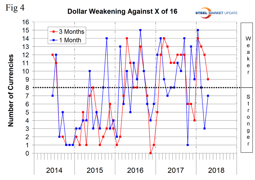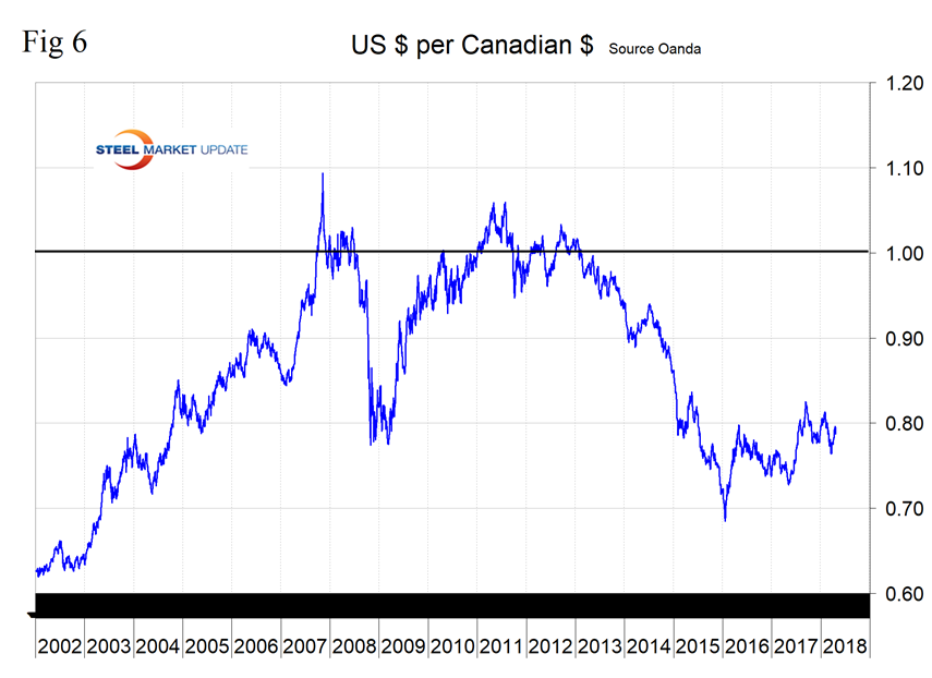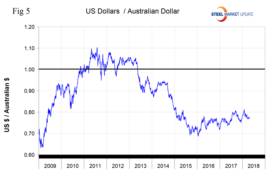 Australia’s dollar has declined by 3.7 percent in the last three months and by 0.1 percent in the last month (Figure 5). Australia is not a major exporter of steel to the U.S., but we include them in this report because of their global significance as a supplier of iron ore and coking coal.
