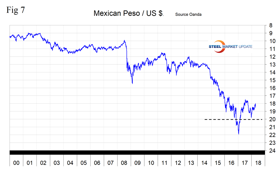 Mexico’s peso has gained 1.3 percent in the last month and over a three-month period is up by 1.0 percent (Figure 7). Mexico is the third major importer of steel into the U.S. with a total of 3.9 million metric tons since and including February last year. Twenty-eight percent of Mexico’s volume is semi-finished. Other major products are: OCTG, 13 percent; cold rolled sheet, 7 percent; drawn wire, 6 percent; and line pipe, 5 percent.