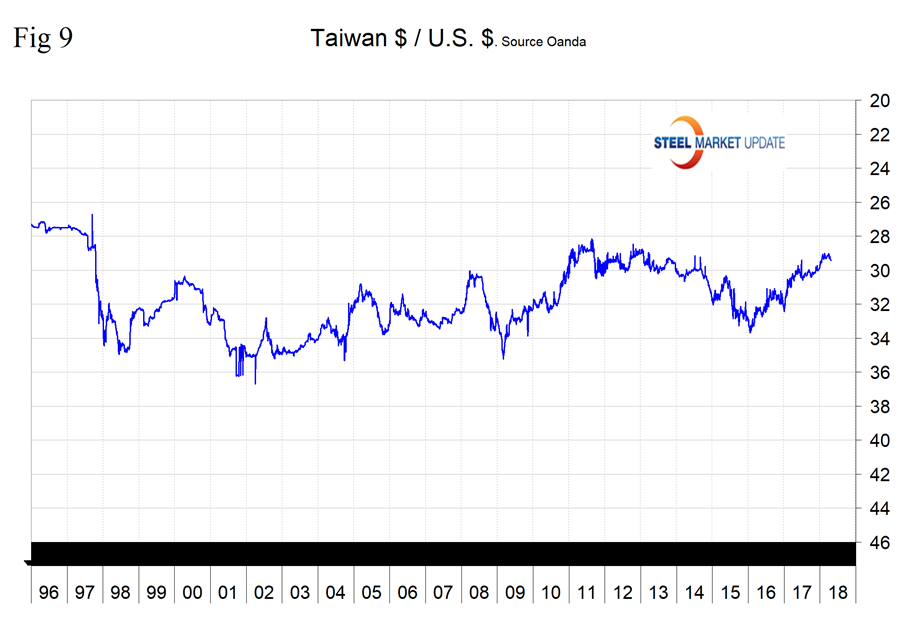 Taiwan’s dollar has lost 0.95 percent in the last month but is up by 0.33 percent in three months (Figure 9). Since and including February last year, Taiwan has shipped 1.197 million metric tons into the U.S, putting them in ninth place. Most of their tonnage was in three products: all other metallic coated sheets, (mainly Galvalume), 32 percent; OCTG, 15 percent; and HDG sheet, 20 percent.