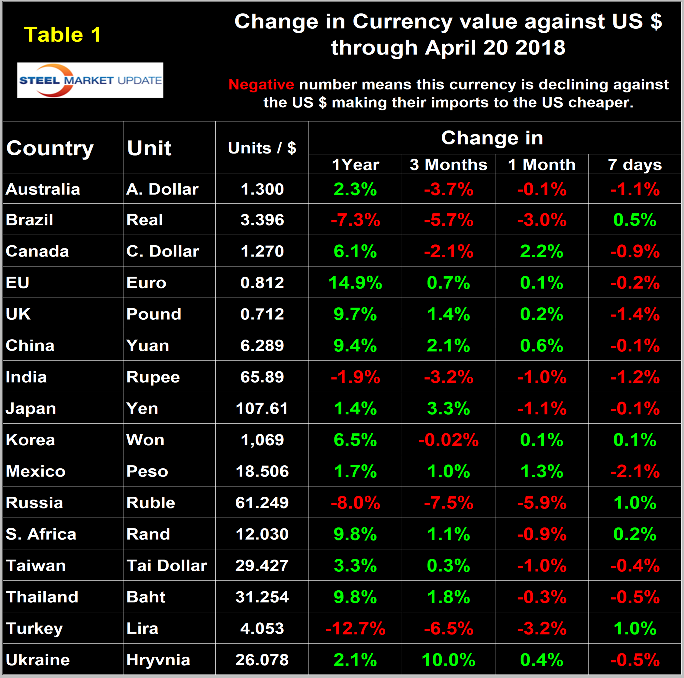 Each month, SMU publishes an update of Table 1, which shows the value of the U.S. dollar against the currencies of 16 major global steel and iron ore trading nations. The table shows the change in value in one year, three months, one month and seven days through April 20.