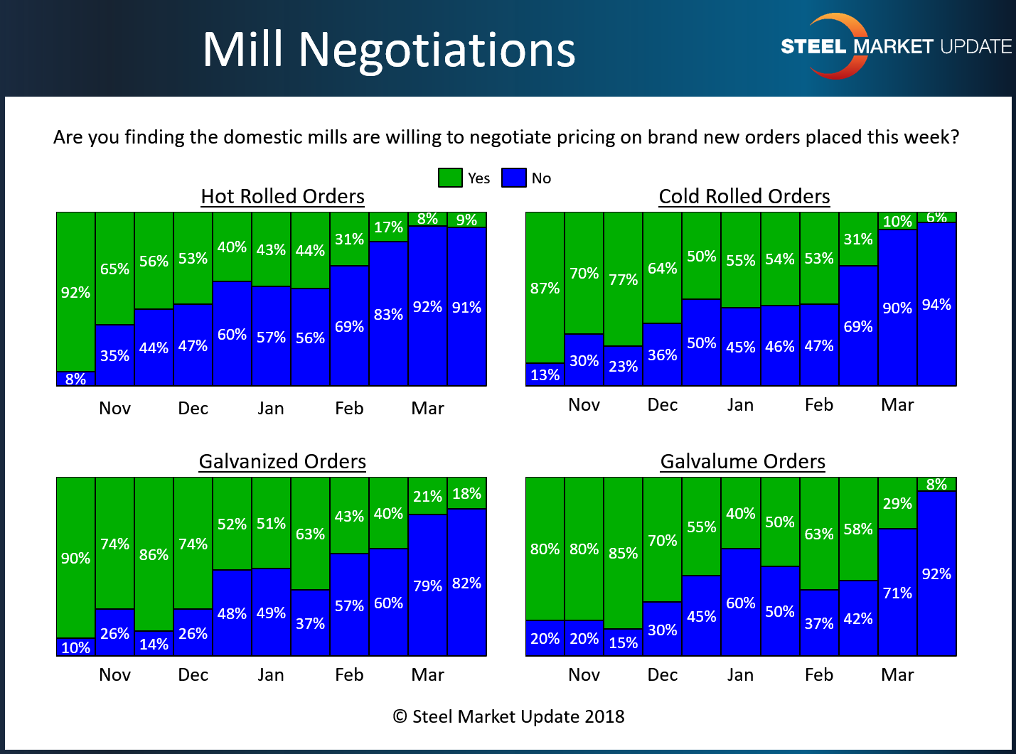 In the galvanized sector, about 82 percent of respondents said the mills are now standing firm on galvanized prices, while 18 percent said some mills are still open to negotiation on coated products. That’s more than a 20-point shift from just one month ago when 60 percent said mills were holding the line.