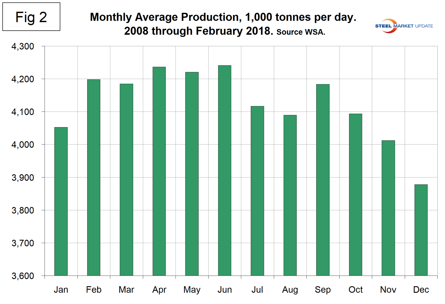 As we dig deeper, we start with seasonality. On average, global production has peaked in the early summer for the last seven years with April and June having the highest average volume. Figure 2 shows the average tons per day of production for each month since 2008. In those 11 years on average, February has been up by 3.6 percent; this year February was up by 0.73 percent.