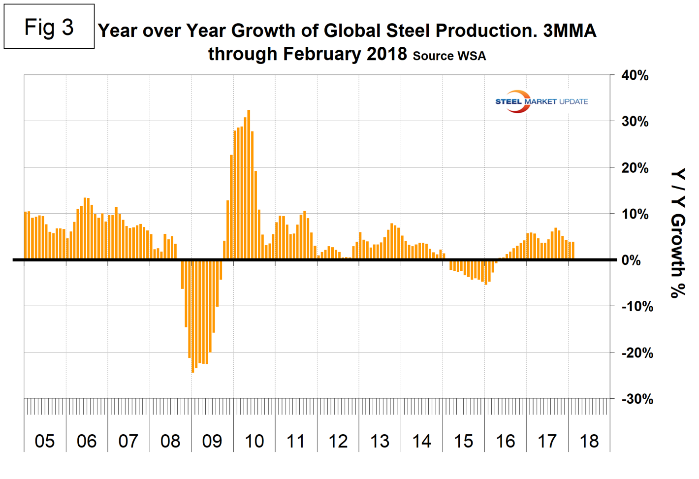 SMU Comment: On a 3MMA basis year over year through February, the world as a whole had a growth rate of 3.8 percent, but China grew at 4.5 percent and the rest grew at 3.2 percent. Hopefully this trend does not continue. If it does, Chinese pressure on the global market will worsen. WSA increased its forecast for production in 2018 from 1,548.5 million metric tons in April to 1,648.1 million metric tons in its October forecast. This would be a projected growth of 1.6 percent in 2018, which based on the present momentum seems low. Globally, steel is back on a roll, driven primarily by construction in the developing world. The emerging and developing economies saw their GDP decline from 2010 through 2015 after which there was a turnaround that the IMF believes will continue through the 2022 forecast. We expect the IMF to raise the forecast of global growth in its April update.