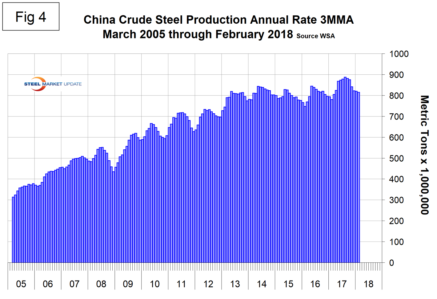 Figure 4 shows China’s production since 2005 and Figure 5 shows the year-over-year growth. After slowing for 13 straight months year over year, China’s production returned to positive growth each month from May 2016 through February 2018. On March 5, the National Development and Reform Commission (NDRC) said in a work report that China will reduce steel capacity by around 30 million metric tons and coal output by about 150 million tons this year, putting the country on track to beat its long-term targets, as Beijing reinforced its vow to beat smog and make “skies blue again.” The cuts would put the world’s top steelmaker and coal miner on track to meet its 2020 targets in the government’s five-year plan about two years ahead of schedule. The 2018 cuts were higher than expected, said Zhang Min, a coal market analyst at China Sublime Information Group. “Setting a high target this year showed the government is not slowing down the pace of reform for the two industries.”