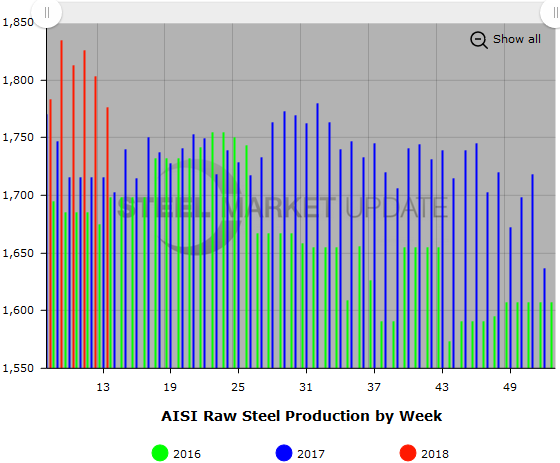 Below is a graph showing the history of weekly raw steel production. You will need to view the graph on our website to use its interactive features; you can do so by clicking here. If you need assistance logging into or navigating the website, please contact our office at 800-432-3475 or info@SteelMarketUpdate.com.