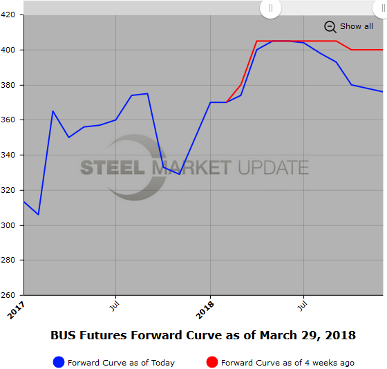 Below is another graph showing the history of the busheling scrap futures forward curve. You will need to view the graph on our website to use its interactive features; you can do so by clicking here.