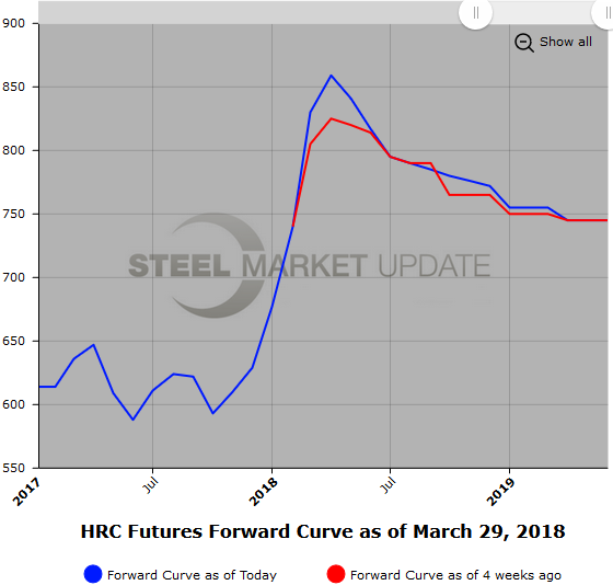 March has proven to be a volatile month for HR futures with all the uncertainty that revolved around potential tariffs linked to national security. However, the nearby (Apr’18) HR futures price remains basically unchanged at $860-865/ST, which is about $5-10/ST above where a number of the indexes have reported spot physical HR trading.