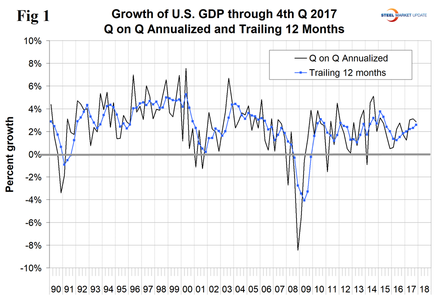 GDP is measured and reported in chained 2009 dollars, and on an annualized basis in the fourth quarter was $17.287 trillion. The growth calculation is misleading because it takes the quarter-over-quarter change and multiplies by four to get an annualized rate. This makes the high quarters higher and the low quarters lower. Figure 1 clearly shows this effect. The blue line is the trailing 12-months’ growth and the black line is the headline quarterly result. On a trailing 12-month basis, GDP was up by 2.58 percent in Q4, which was the best result since Q2 2015 and better than the 2.15 percent average in 32 quarters since Q1 2010. Therefore, we conclude that the current growth of U.S. GDP is better than its average for the last eight years.