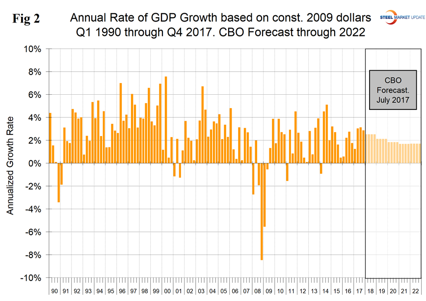 Figure 2 shows the headline quarterly results since 1990 and the July 2017 Congressional Budget Office forecast through 2022. Growth in the fourth quarter was better than the CBO forecast. The IMF forecasts global and national economic growth each April and October. In the October 2017 IMF update, the forecast of U.S. economic growth was revised down for each year through 2022. The 2017 growth forecast was revised from 2.31 percent down to 2.18 percent, while the 2018 forecast was adjusted from 2.52 percent down to 2.34 percent. Evidently, the IMF significantly underestimated the 2017 performance, and we expect an upward revision next month.