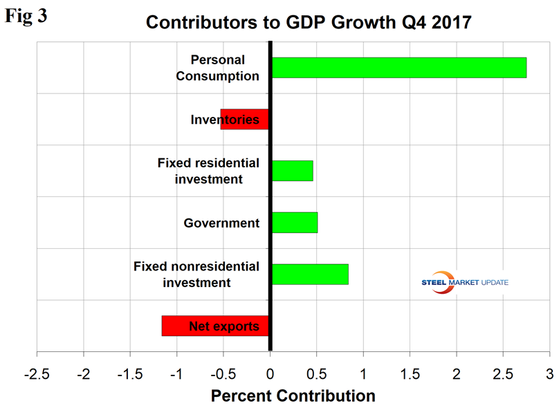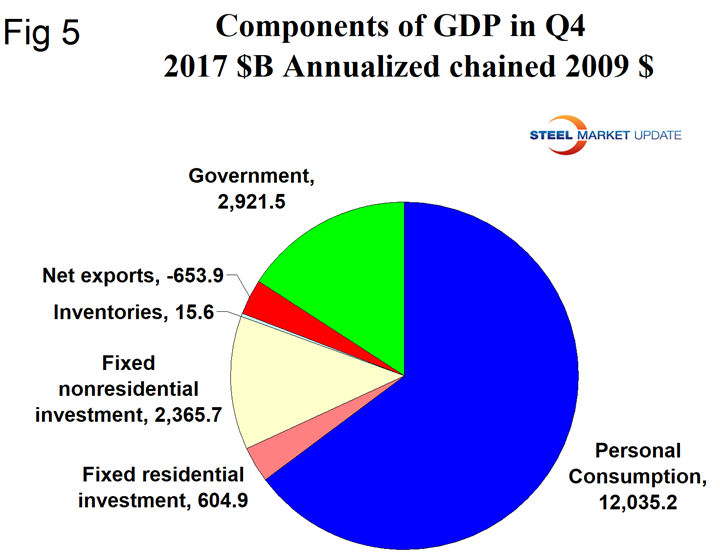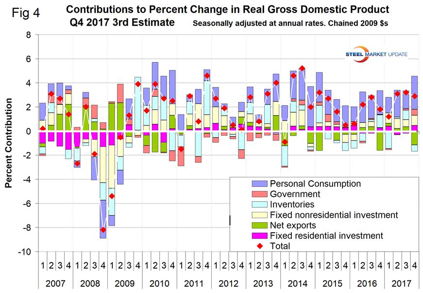 Figure 3 shows the change in the six major subcomponents of GDP in Q4 2017. Normally, personal consumption is the dominant growth driver, and this continued to be the case. Personal consumption includes goods and services, the goods portion of which includes both durable and non-durables. Inventories and the trade balance detracted from the fourth-quarter performance.