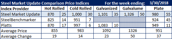 All three of the steel indexes followed by Steel Market Update reported their average prices this past week. The lag of SteelBenchmarker pricing is very evident as they lagged well behind our index as well as that of Platts.