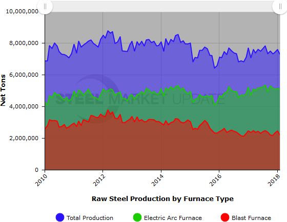 The chart below shows total monthly steel production (blue) broken down by electric arc furnace production (green) and blast furnace production (red).