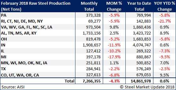 Total raw steel production for the month of February was 7,266,355 net tons, with 5,087,819 tons produced by electric arc furnaces (EAFs) and 2,178,536 tons produced by blast furnaces. February raw steel production was 329,268 tons or 4.3 percent lower than the previous month, but 185,893 tons or 2.6 percent higher than the same month last year, reports the American Iron and Steel Institute (AISI) in Washington. AISI’s monthly estimates are different than the weekly estimates we report; the monthly estimates are based on over 75 percent of the domestic mills reporting versus only 50 percent reporting for the weekly estimates.